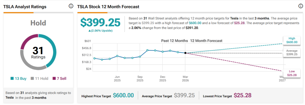 Most of Wall Street remains confident a crash will not come for the EV maker and, per the data Finbold retrieved from TipRanks on March 16, the car company’s equity is overall rated as a ‘Hold.’ Similarly, Tesla stock is, on average, expected to hit $399.25 in the coming 12 months.