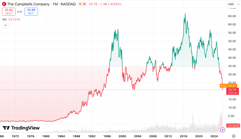 At press time, April 20, 2026, the picture is no less dire, as Campbell’s stock last closed at $20.79, the lowest level in nearly twenty-three years.