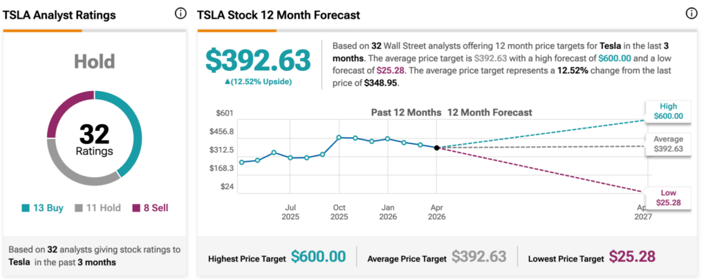 Regarding the EV maker’s stock price outlook, based on 32 analyst ratings compiled by TipRanks, Tesla holds an overall ‘Hold’ rating, with 13 ‘Buy’, 11 ‘Hold’, and 8 ‘Sell’ recommendations.